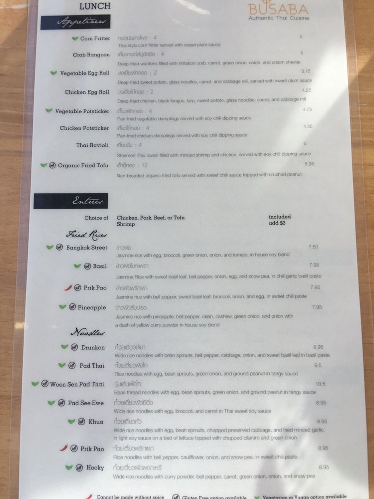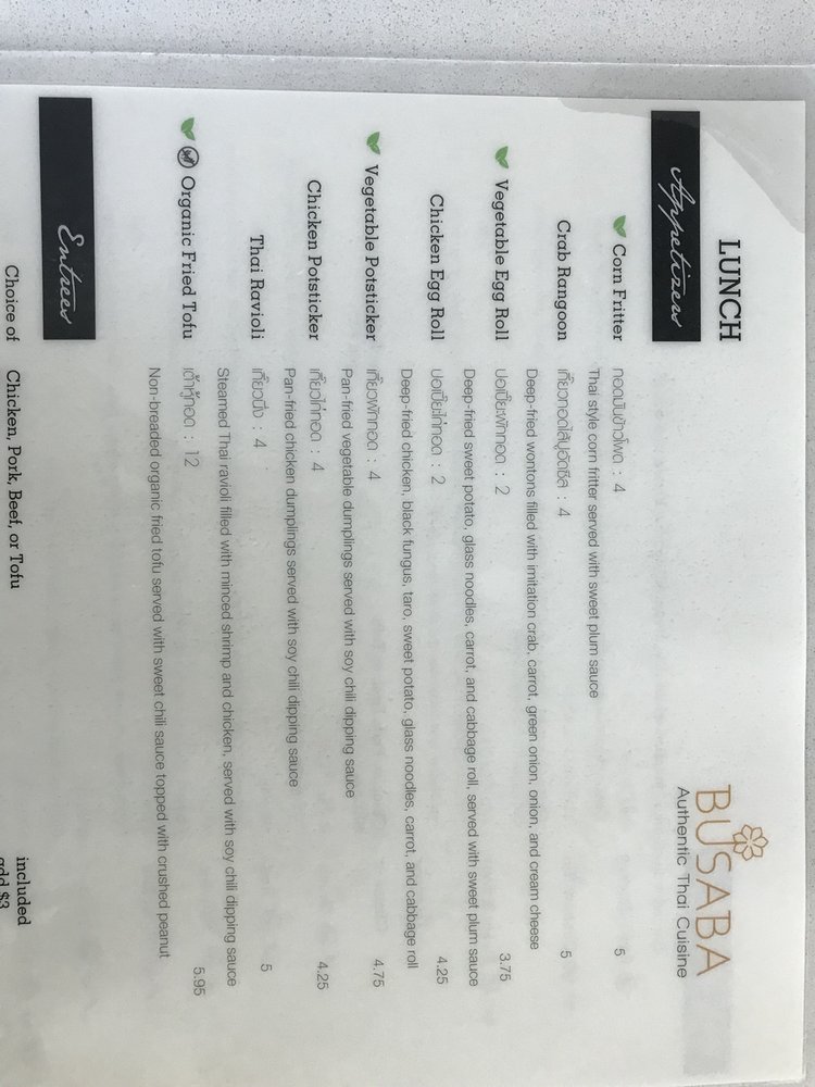 Busaba, located in Louisville, CO, offers a diverse menu with a focus on Thai cuisine. The restaurant provides various amenities such as takeout, delivery, and wheelchair accessibility. Customers rave about dishes like the Busaba Chicken Puff, Chicken Potsticker, and Drunken Noodles. Reviews highlight the friendly staff and fresh, flavorful food. The restaurant caters to dietary preferences with vegan and vegetarian options. With a casual atmosphere and moderate noise level, Busaba is suitable for families, groups, and individuals alike. The menu features a range of appetizers, soups, and noodles, each crafted with authentic Thai flavors. From the savory Tom Kha soup to the indulgent Pumpkin Curry with Chicken, every dish at Busaba delivers a memorable dining experience.